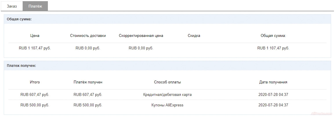 Но если перейти через кнопку "Подробнее" и во вкладке "платёж" можно увидеть что моя фактически оплаченная сумма с Банковской карты составила всего 607,47 руб а остальные 500,00 руб мне сминусовал Купон AliExpress.