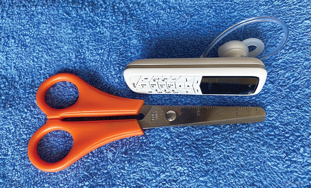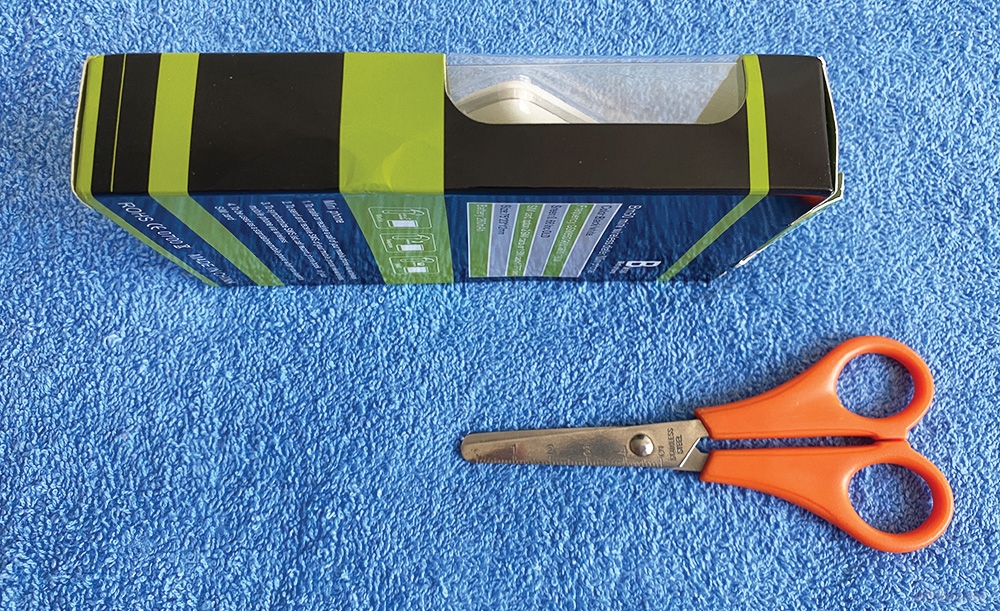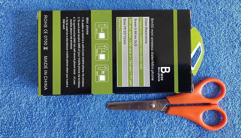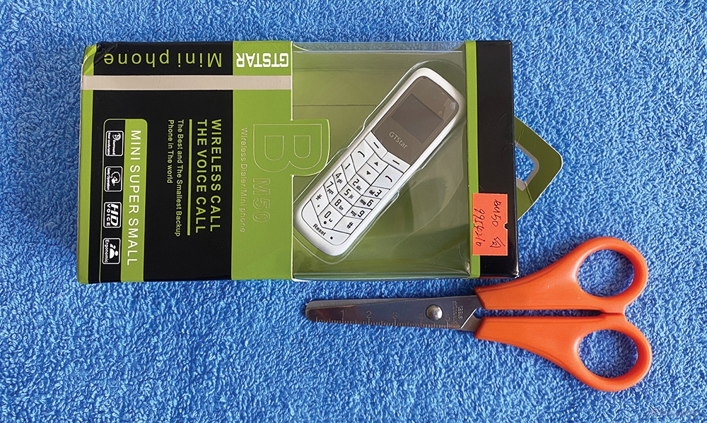 Коробка очень маленькая - это можно узнать посмотрев на ножницы, на которых присутствует линейка. Телефон так же должен быть маленький: 74,4 мм - 11.2 мм - 23.3мм где 74.4 мм длинна телефона а 23.3мм ширина.