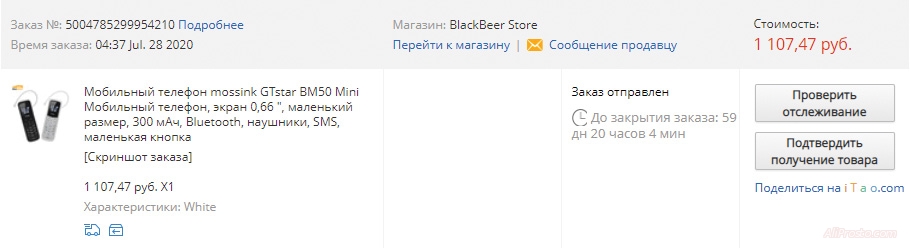 Мой заказ дешевого телефона на алиэкспресс за 1107,47 руб выглядит так