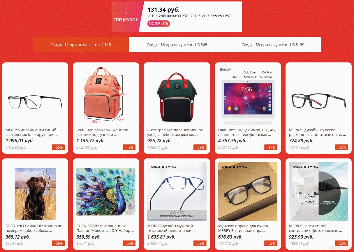 А так же, огромное кол-во товаров на алиэкспресс, разделённые по объёму Спецкупонов: Скидка $2 при покупке от US $15, Скидка $6 при покупке от US $65, Скидка $8 при покупке от US $150.
