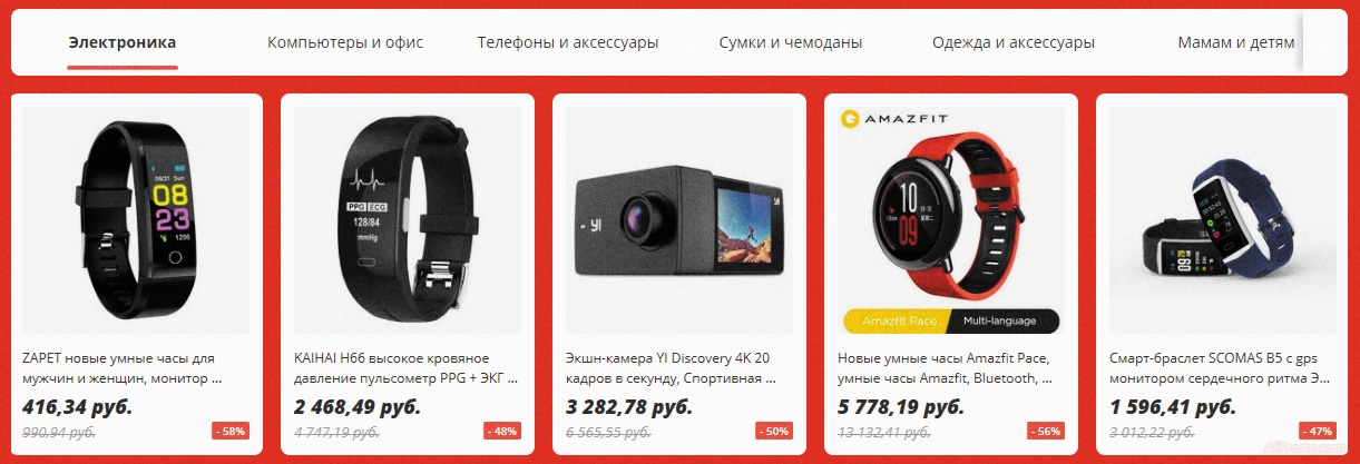 Данная подборка очень удобно разделена такие категории товаров как: Специально для Вас (на основе интересов аккаунта), Дом и сад, Электроника, Мамам и детям игрушки, Телефоны и аксессуары, Компьютеры и безопасность, Одежда, Инструменты и обустройство, Красота и здоровье, Модные аксессуары, Автотовары, Спорт и отдых, Сумки и обувь