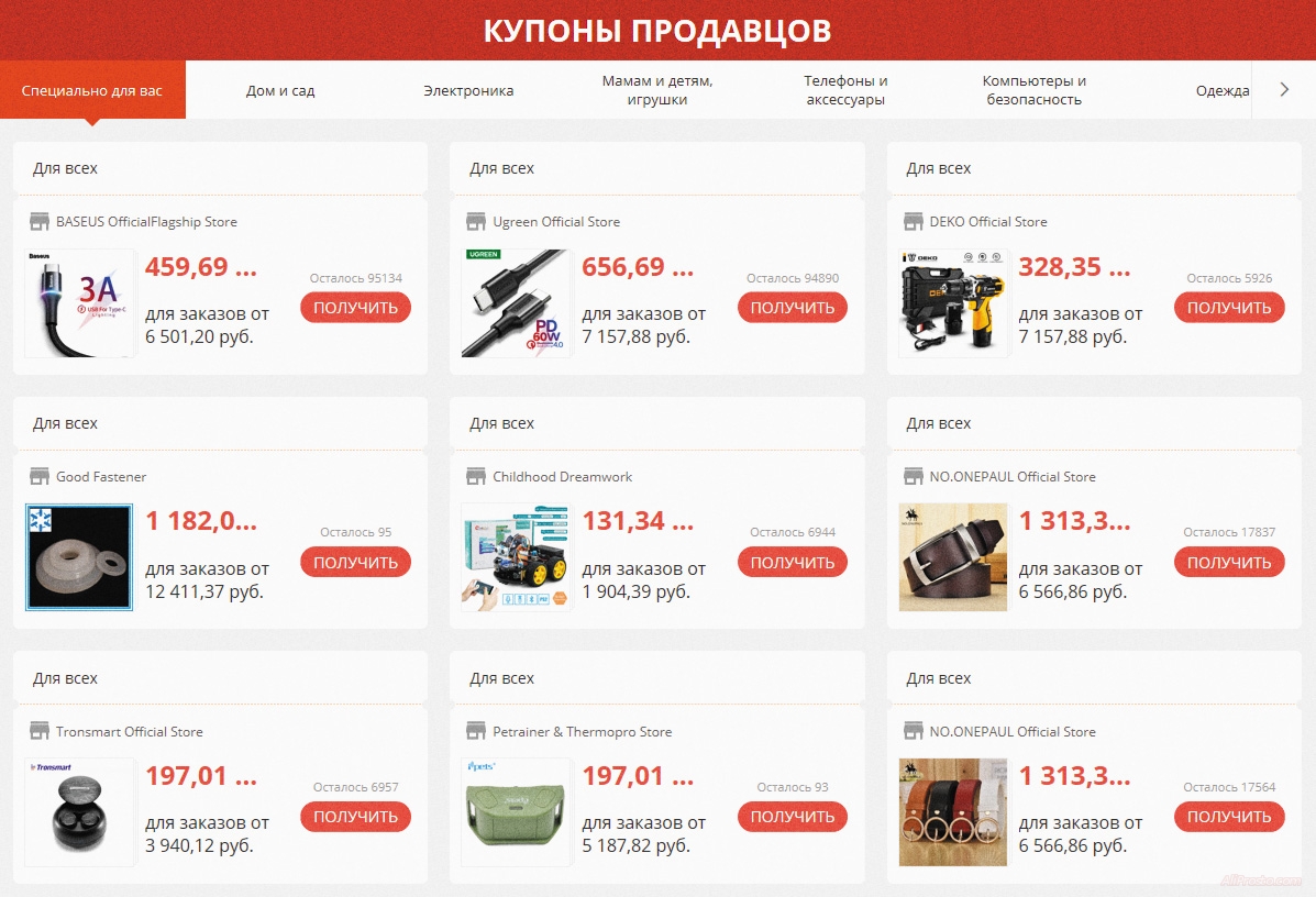 И стандартно, алиэкспресс сделал отдельную страницу с товарами - которая расформирована по категориям Спецкупонов