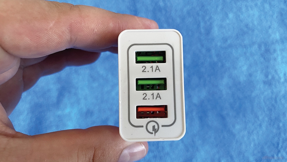 Как видно на фото адаптер писания имеет 2-а разъёма по 2,1А и дополнительный оранжевый разъём с быстрой зарядкой в 2,5А с USB 3.0 - ссылку на адаптеры оставлю в комментариях а мы продолжаем обзор мини портативного кондиционера с алиэкспресс