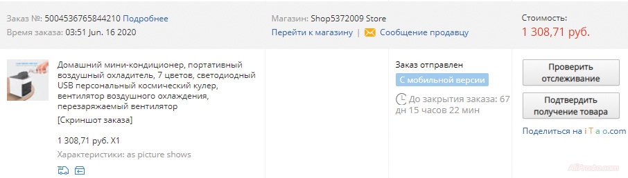 Но всё же 16 июня в 13:51 по МСК решаю купить мини кондиционер на алиэкспресс и совершаю заказ с ценой 1 308,71 руб - ссылку оставлю в комментариях