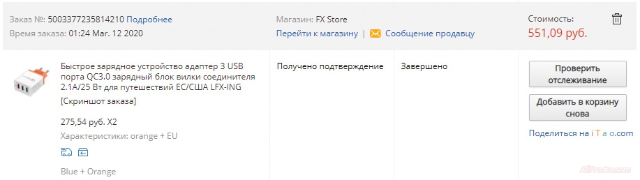 Заказывал два Зарядных устройств с алиэкспресс за 551,09 руб.