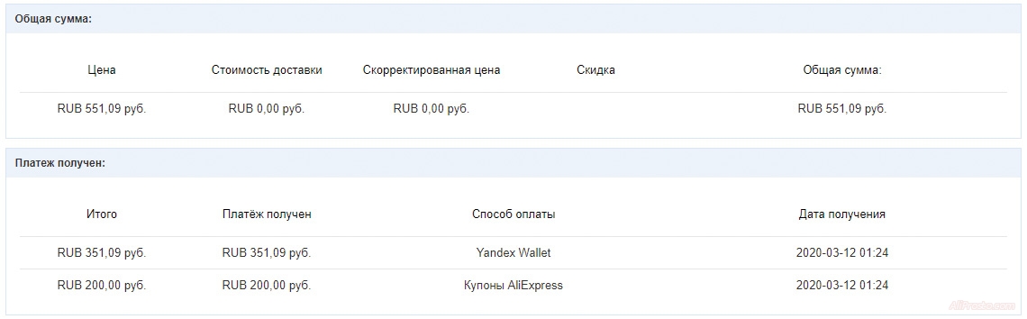 Естественно если перейти через кнопку - Подробнее, то можно увидеть что к заказу был применен Купон AliExpress на скидку в 125 рублей
