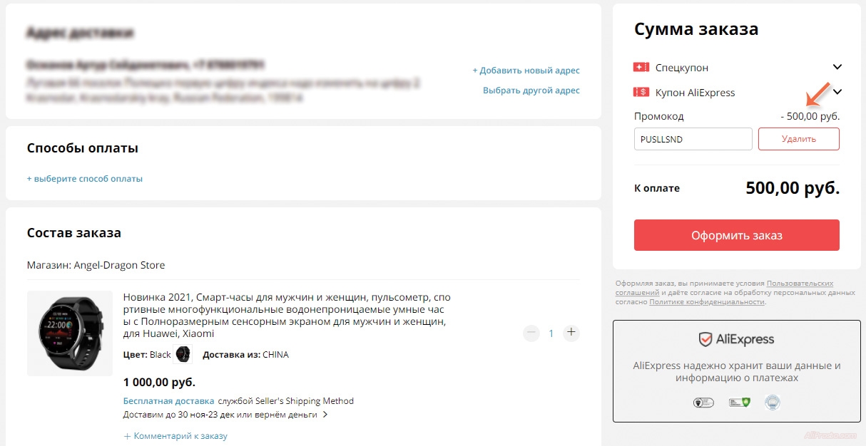 И как видим мы получили скидку -500 рублей, применив промокод нового пользователя алиэкспресс на первый заказ