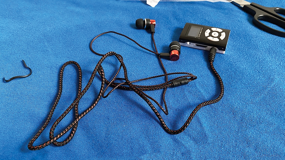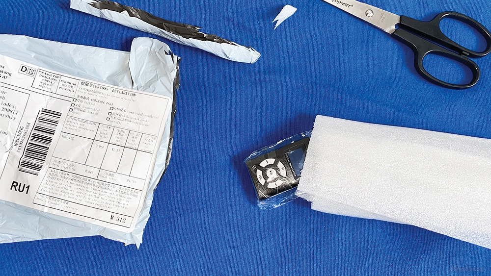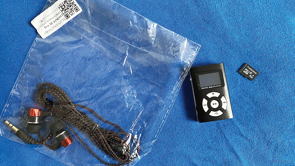 Для этого распакуем наушники со стандартного пакета алиэкспресс и положим около плеера и флешки
