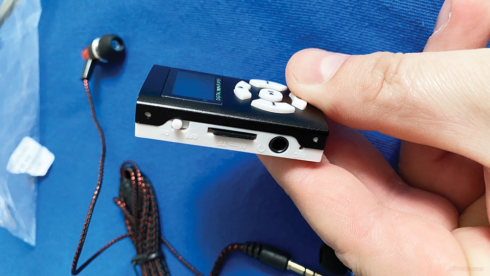 Наверное нам надо подключить к данному дешевому мп3 плееру - дешевые наушники и всунуть флешку ( micro sd ) в нужный разъём.
