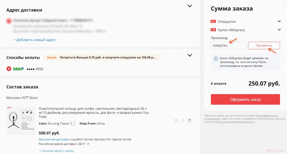 И видим что сумма нашего заказа на алиэкспресс уменьшилась на 250 рублей и стала 250.07 рублей и теперь можно нажимать кнопку "Оформить заказ"