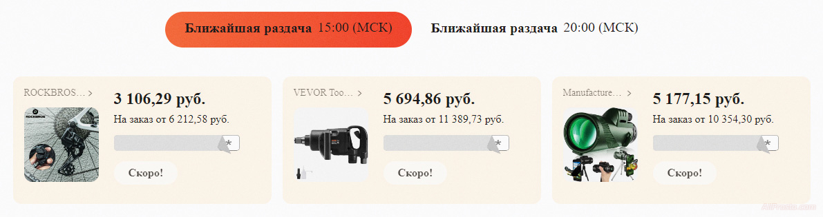 Теперь АлиЭкспресс 11.11 раздаёт рабочие выгодные купоны алиэкспресс на определённые товары в 15:00 и 20:00 по МСК.